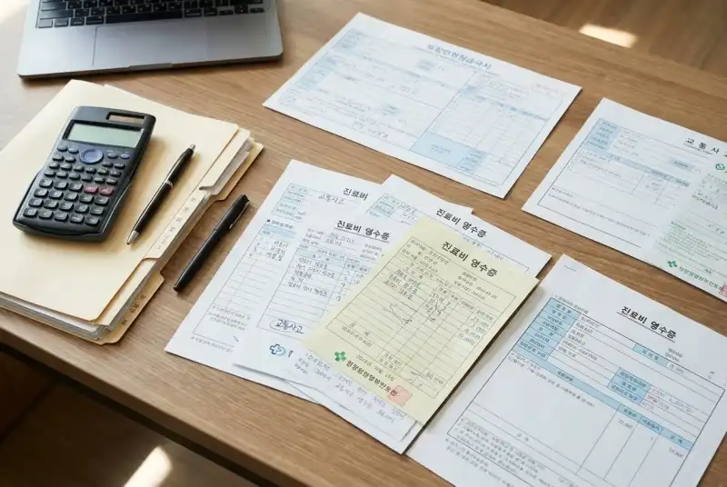 세 번째는 치료비 영수증이에요. 병원비, 약제비, 물리치료비, 한방치료비 등 모든 치료 관련 지출 내역을 증명하는 영수증을 빠짐없이 모아둬야 해요. 실제로 한 사용자는 물리치료 영수증 15장 중 3장을 잃어버려서 40만 원을 청구하지 못했다는 후기를 남겼어요. 영수증은 원본 보관이 원칙이고 사본이나 사진도 함께 남겨두는 게 안전해요.