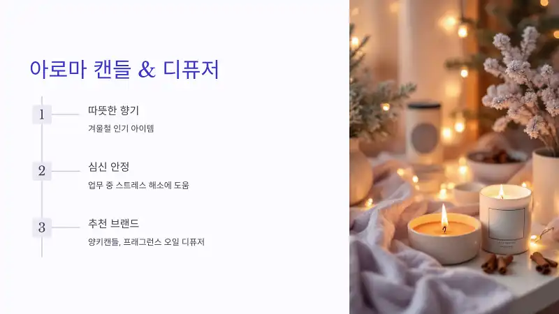 κ²¨μšΈμ² μ—λŠ” λ”°λœ»ν•œ ν–₯κΈ°κ°€ λŠκ»΄μ§€λŠ” μ•„λ‘œλ§ˆ μ œν’ˆλ„ μΈκΈ°λžλ‹ˆλ‹€. μ•„λ‘œλ§ˆ μΊ”λ“€μ΄λ‚˜ λ””ν“¨μ €λŠ” 업무 쀑에도 심신을 μ•ˆμ •μ‹œν‚€λŠ” 데 도움을 쀄 수 μžˆμ–΄ λ™λ£Œλ“€μ—κ²Œ 큰 ν˜Έμ‘μ„ 얻을 κ±°μ˜ˆμš”. 😌✨