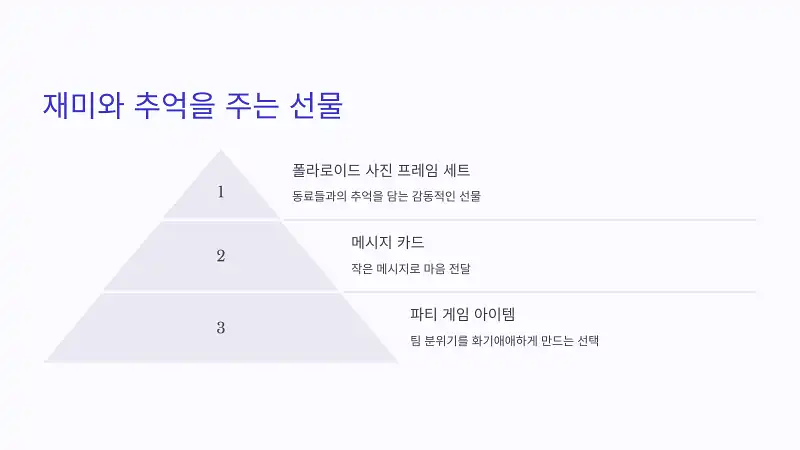 μ„ΌμŠ€ μžˆλŠ” 선물은 λΉ„μ‹Ό 가격이 μ•„λ‹ˆλΌ, μ •μ„±κ³Ό λ°°λ €μ—μ„œ λ‚˜μ˜΅λ‹ˆλ‹€. 🎁✨ μœ„μ˜ 아이디어λ₯Ό μ°Έκ³ ν•΄ λ™λ£Œλ“€μ˜ 성격과 μ·¨ν–₯을 잘 μ‚΄νŽ΄λ³΄κ³ , μž‘μ€ λ©”λͺ¨λ‚˜ μ†νŽΈμ§€λ₯Ό 곁듀인닀면 ν•œμΈ΅ 더 λ”°λœ»ν•œ 선물이 될 κ±°μ˜ˆμš”. πŸ˜ŠπŸ’Œ